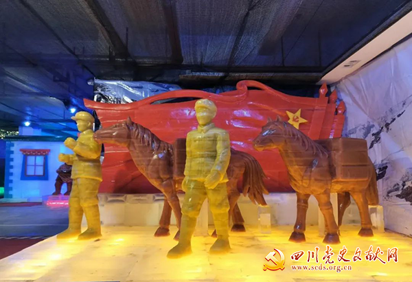 1936年,朱德、贺龙、任弼时、刘伯承、徐向前等一批红军领导人带领5万余名红军战士先后途径色达北上抗日,把伟大的长征精神播撒在了色达草原上。“红军长征在色达”主题冰雕馆就是以此为灵感,邀请哈尔滨国家级冰雪雕非遗大师设计制作,以红军长征精神为主题,以红军二、四方面军途经色达县的英雄壮举史实为线索,把色达人民群众为红军筹粮、提供军需、积极参加红军、照顾红军伤残的生动故事以冰雕艺术展示出来。该馆还将唐卡艺术的美学风格作为冰雪“底色”,使冰雕馆集革命文化、藏族传统艺术、冰雪雕非遗技艺、冰雪体验旅游于一体。