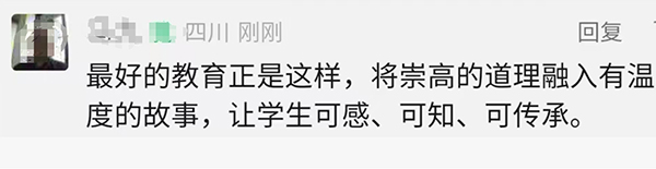 泸州高中教师麻正伟留言道,“最好的教育正是这样,将崇高的道理融入有温度的故事,让学生可感、可知、可传承。”