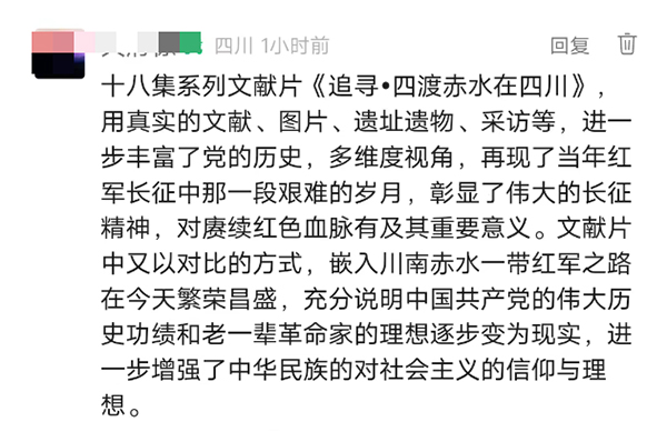 泸州老窖天府中学退休历史老师徐仁权评论道,文献电视片以多维度视角,再现了当年红军长征中那一段艰难的岁月,彰显了伟大的长征精神,对赓续红色血脉有及其重要意义。文献电视片中又以对比的方式,嵌入川南赤水一带红军之路在今天繁荣昌盛,充分说明中国共产党的伟大历史功绩和老一辈革命家的理想逐步变为现实,进一步增强了中华民族对社会主义的信仰与理想。