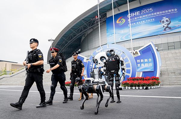 9月26日,科博会上,人形巡逻机器人及警用机器狗配合执勤民警巡逻。 唐超 摄(C视觉)