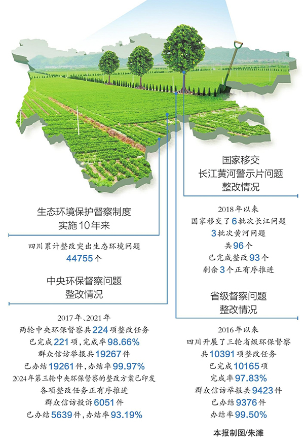 同日 省生态环境厅例行新闻发布会发布数据,四川已整改44755个突出生态环境问题。这是生态环境保护督察制度实施10年以来,四川已整改完成的突出生态环境问题总数。