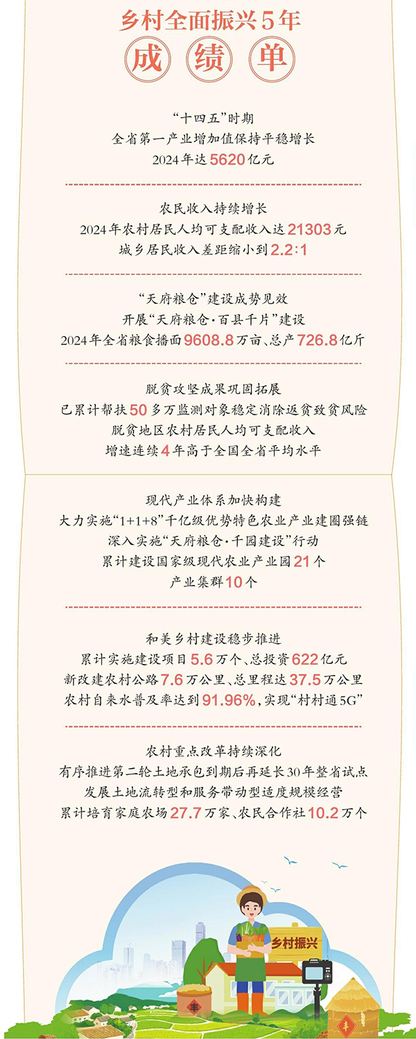 同日 省政府新闻办举行“决胜‘十四五’续写新篇章”系列主题新闻发布会第六场,介绍四川“十四五”时期推进乡村全面振兴主要成就。“十四五”时期,四川锚定打造新时代更高水平“天府粮仓”、加快建设农业强省的目标,在推进乡村振兴上全面发力,推动“三农”工作取得新成效:全省第一产业增加值保持平稳增长,2024年达5620亿元;农民收入持续增长,2024年农村居民人均可支配收入达21303元,城乡居民收入差距缩小到2.2∶1。