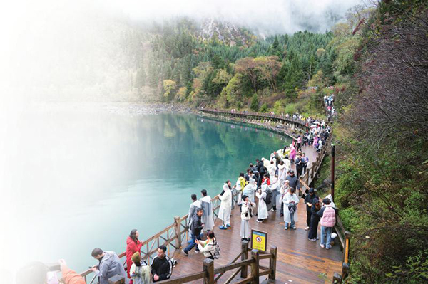 10月20日,尽管小雨淅沥,但仍未影响游客们游览九寨沟的热情。唐磊 摄(C视觉)
