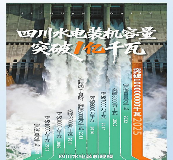 同日 金沙江银江水电站在攀枝花全面投产发电。至此,四川水电装机容量迈过1亿千瓦大关,成为全国首个进入水电“亿千瓦”时代的省份,标志着四川在全国确立清洁能源强省的核心地位,也证明流域梯级开发取得重大的阶段性成果,四川建设巨型水电工程的技术实力已独步全球。截至目前,四川全口径外送电量已超1.9万亿千瓦时,这一规模相当于江苏、浙江、安徽三省全年用电量之和。