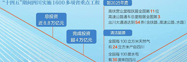 同日 省发展改革委公布数据,“十四五”期间,四川实施1600多项省重点工程,总投资近8.8万亿元,完成投资超4万亿元。以交通、能源、水利、通信网络及新基建为代表的重大工程,加快畅通战略大通道,重塑四川经济地理。