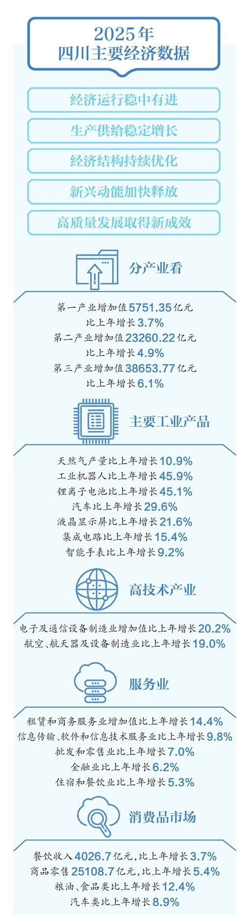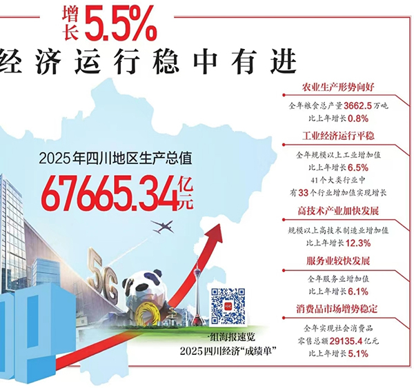 同日 省政府新闻办召开2025年四川经济形势新闻发布会发布信息,2025年,四川经济运行稳中有进,生产供给稳定增长,经济结构持续优化,新兴动能加快释放,高质量发展取得新成效。根据地区生产总值统一核算结果,2025年四川地区生产总值为67665.34亿元,按不变价格计算,比上年增长5.5%。